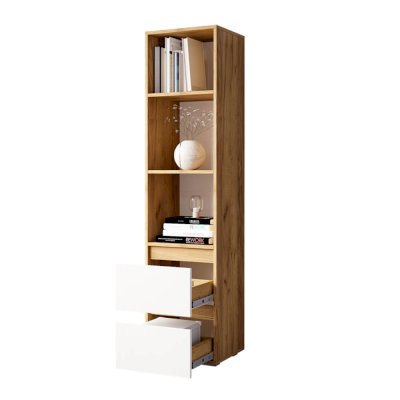 Пенал Селфи – идеальный выбор для хранения в современном кабинете или детской. Сочетание белых фасадов и цвета крафт в корпусе изделия, позволяет ему стать частью современного интерьера. Модель представляет собой открытые полки, верхнее отделение с распашной дверцей и два нижних выдвигающихся ящика. Разместить все необходимые канцелярские принадлежности, книги или документы не составит труда.