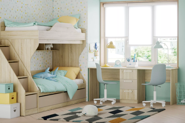 Уникальная конструкция стола поможет обустроить комфортный учебный уголок, если в семье двое детей. На рабочей поверхности модуля достаточно места для размещения не только письменных принадлежностей, но и ноутбука. Закругленные углы столешницы делают эксплуатацию модуля безопасной для детей. По окончании занятий ребенок сможет убрать книги и тетради в выдвижные ящики для поддержания порядка на рабочем месте.