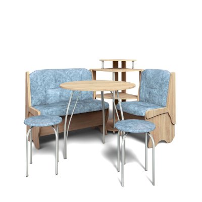 Оригинальный кухонный уголок Лотос отличается от других похожих кухонных гарнитуров. Он состоит из двух отдельных диванчиков и этажерки, заменяющей угловую мягкую часть. Круглый кухонный стол в отличие от других наборов мебели на металлическом основании как и два круглых табурета. Набор мебели для кухни включающий в себя большую прямую скамью,малую прямую скамью,угловую этажерку, стол на металлических ногах и два табурета на металлокаркасе. В прямых скамьях под сиденьями расположены ящики.